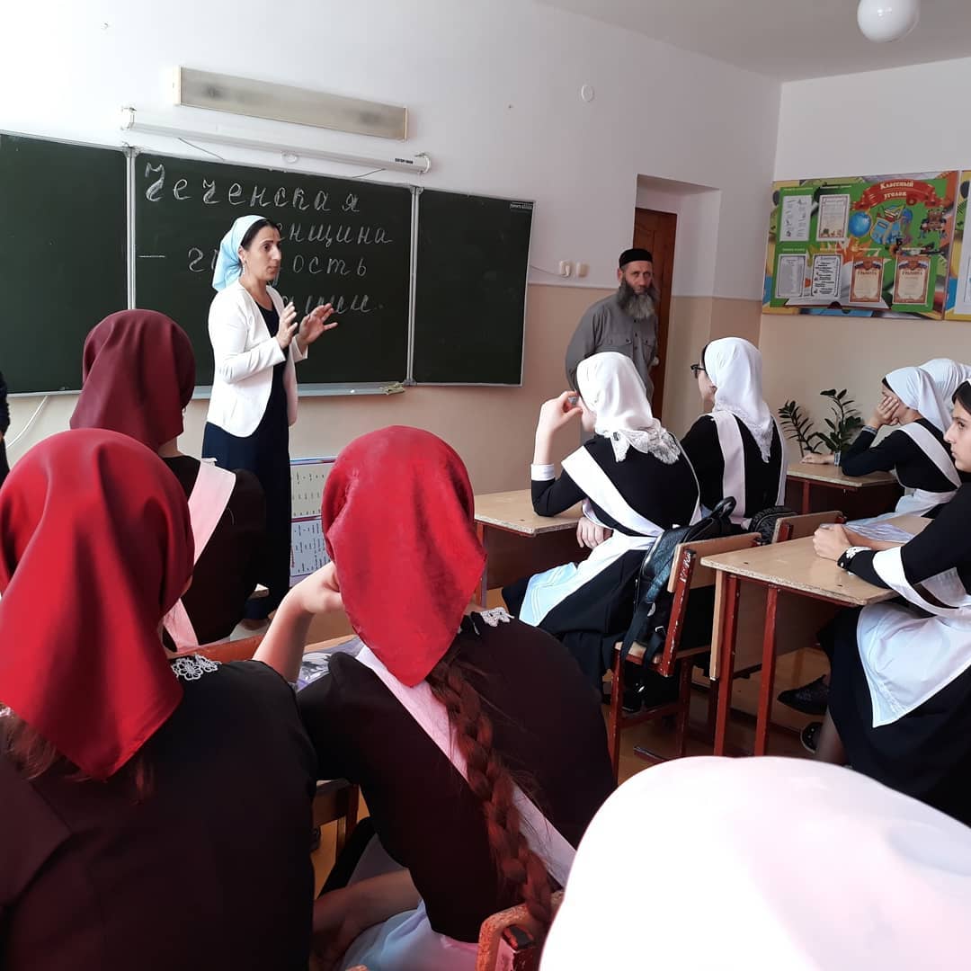 10.09.2019Педагог дополнительного образования по ДНВ Гумаков У.А. совместно заместителем по ВР Келиговой З.Б. провел беседу с девушками на тему: "Чеченская женщина - гордость нации", приуроченный ко Дню Чеченской женщины.