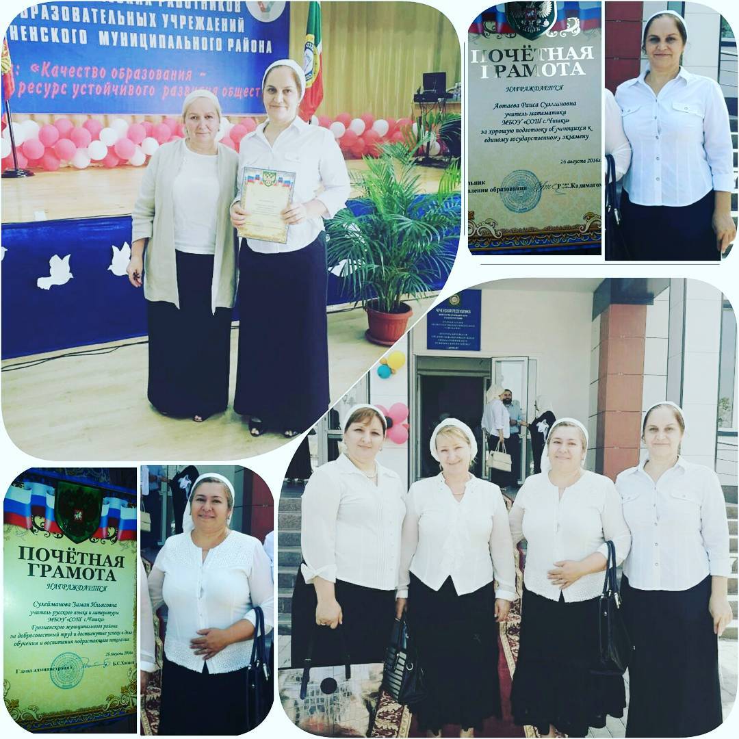26.08.2016Вопросы повышения уровня образования школьников и квалификации учителей обсуждались в Грозном на традиционной ежегодной августовской республиканской педагогической конференции «Итоги государственной итоговой аттестации в Чеченской Республике в 2015 году и задачи по повышению качества образования. Затем состоялась церемония награждения работников образования благодарственными письмами Рособрнадзора за плодотворную работу в период проведения единого государственного экзамена в 2015 году. Зав. РУО Грозненского муниципального района Кадимагомаева Р. Ж. награждает наших учителей за хорошую подготовку к ЕГЭ.