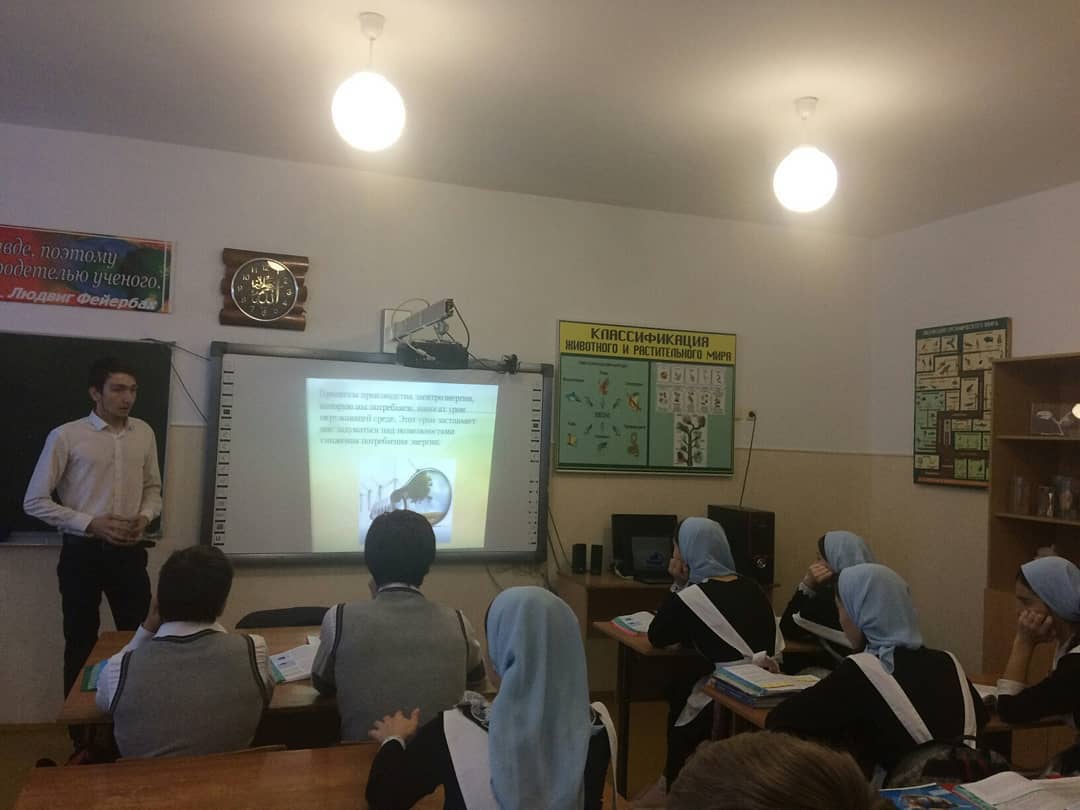 В рамках проекта "Школа грамотного энергопотребления" учитель физики Алиев И. Х-А. провел Всероссийский единый урок по энергосбережению "Вместе ярче".