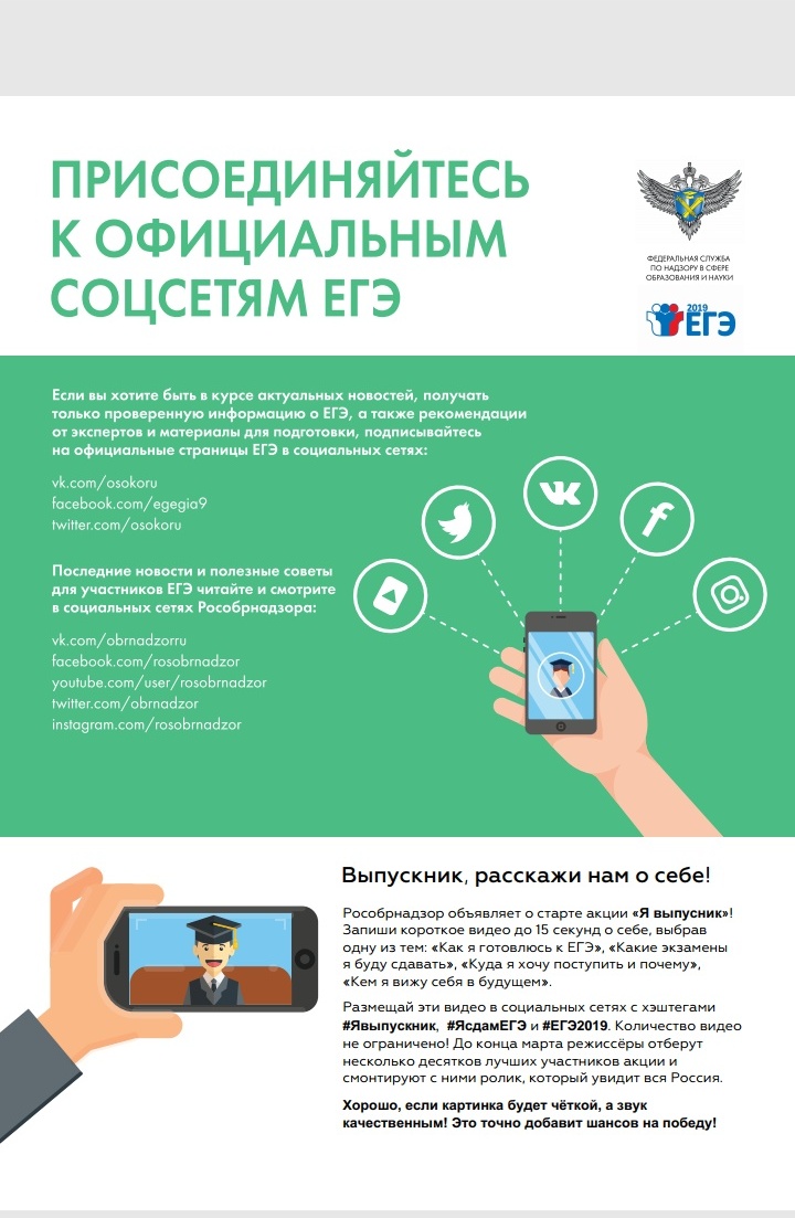 15.02.2019Информационные материалы РОСОБРНАДЗОРА. Информация для учащихся и родителей! Присоединяйтесь к официальным страницам социальных сетях ЕГЭ-2019. Рособрнадзор объявляет о старте акции "Я выпускник"! Запишите короткое видео до 15 секунд о себе, выбрав одну из тем: "Как я готовлюсь к ЕГЭ". "Какие экзамены я буду сдавать". "Куда я хочу поступить и почему". "Кем я вижу себя в будущем". Размещайте эти видео в социальных сетях с хэштегами #Явыпускник, #ЯСдамЕГЭ и #ЕГЭ2019.