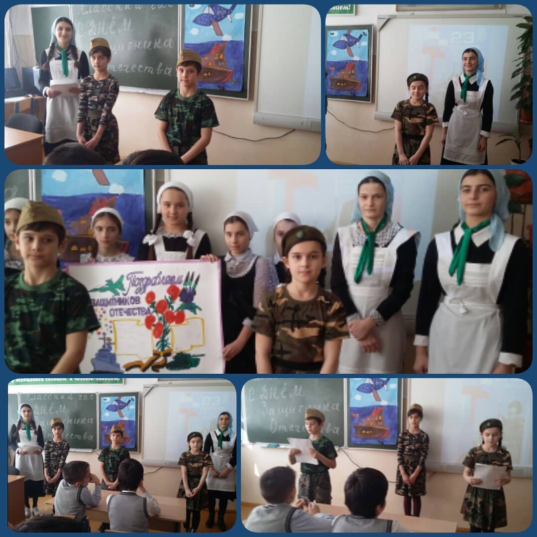 С целью познакомить с историей праздника и поздравить будущих Защитников Отечества ЕДЮО "Юные Кадыровцы" совместно с учителем начальных классов Исраиловой Р.С. провели в 4 классе классный час "День Защитника Отечества"