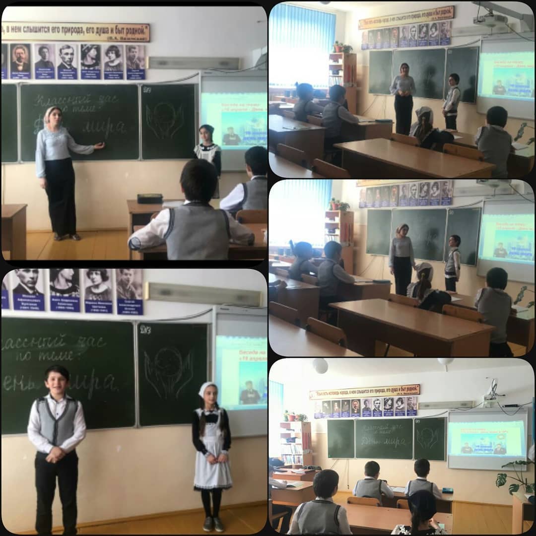 08.04.201908.04.2019г.Сегодня в 5"а" классе классный руководитель Дацаева Р.А. провела классный час по теме "День Мира". Радима Абуевна в доступной форме рассказала ребятам о контртеррористических операциях и об отмене КТО. Рассказала и о том, что как наша республика проходила тернистый путь, прежде чем был объявлен День Победы, это тот день, когда официально 16 апреля признано Днём отмены КТО.