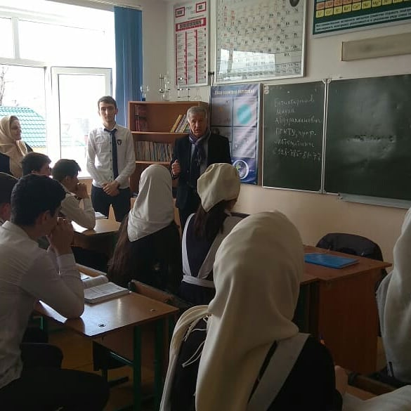 Сегодня нашу школу посетил профессор ГГНТУ и преподаватель профильной математики Бетилгириев Маула Абдурахманович. Он провел беседу по профориетации с обучающимися 11 класса на тему: "За нефтяные кадры".