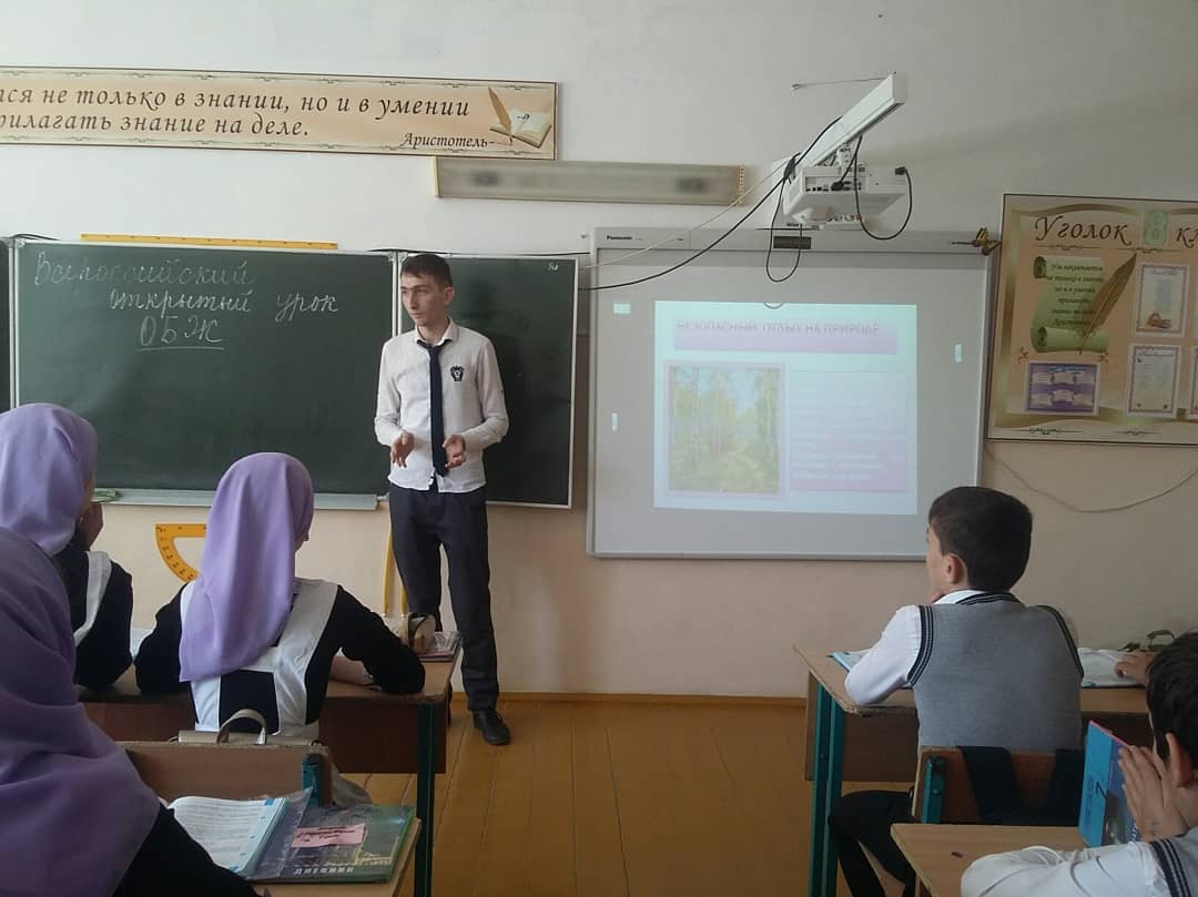 30.04.2019Сегодня учитель физики Алиев И.Х-А. провёл Всероссийский урок по ОБЖ, посвященный безопасному отдыху детей в летний период, их подготовке к летним каникулам, правилам поведения в природной среде, в том числе на водных объектах, действиям при возникновении или угрозе возникновения ЧС природного и техногенного характера в местах массового пребывания людей.